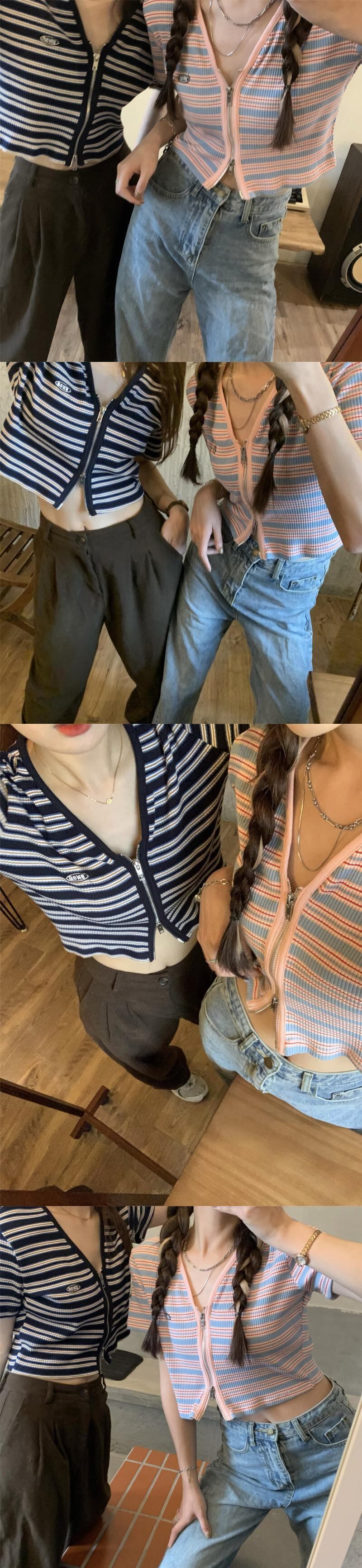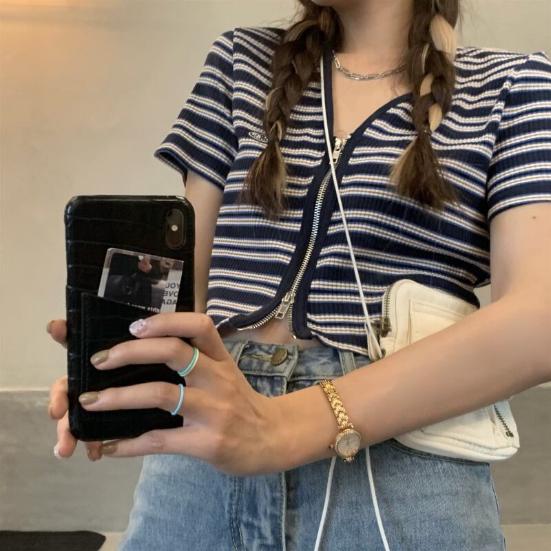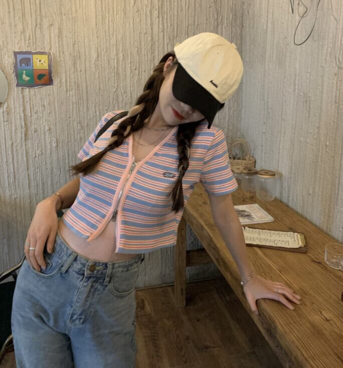ストライプショートTシャツ サマーVネックジッパートップス 夏物 kumikum93994418335