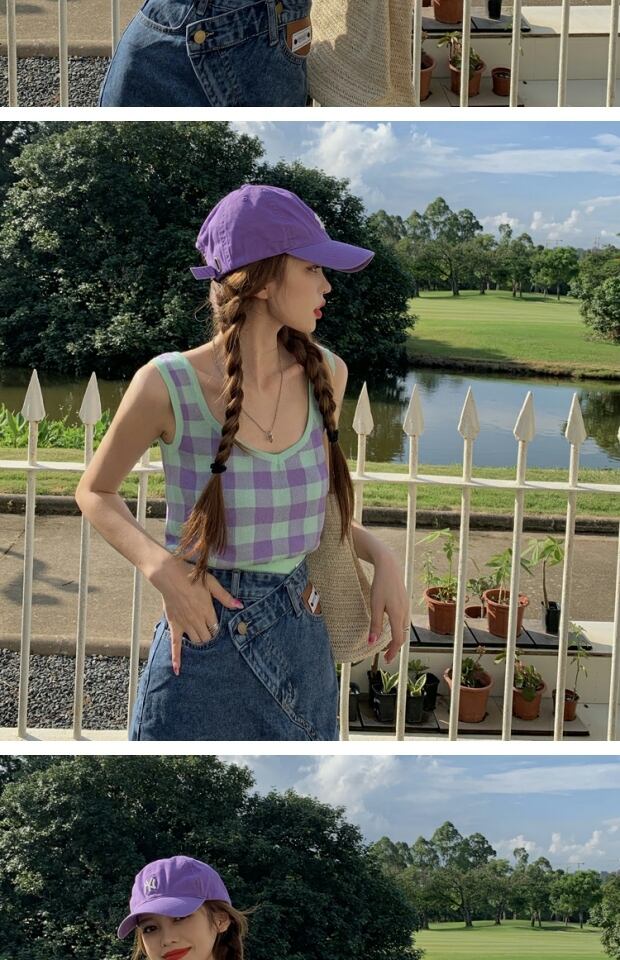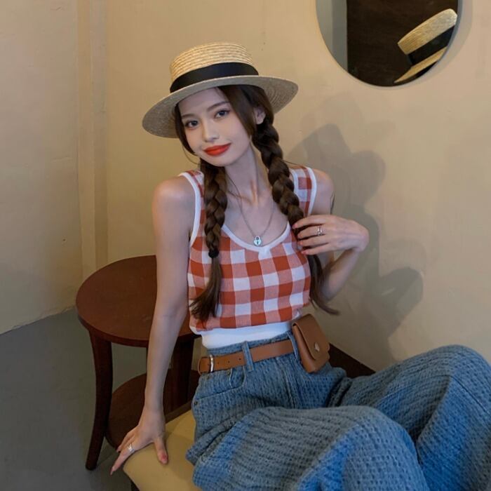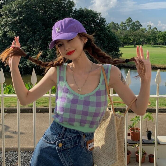 カラー格子柄ニットサマーショート薄手ノースリーブTシャツ トップス レディース 夏物 kumikum79506770620
