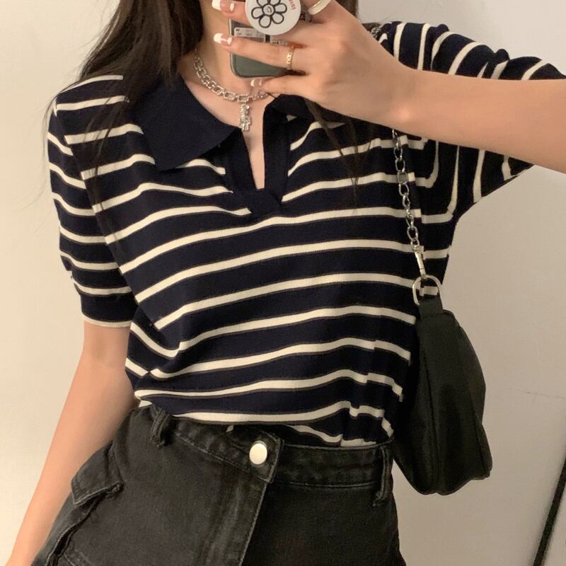 スタイル薄手ストライプセーター Vネックシャツ サマースタンダードルーズトップス レトロ 夏物 kumikum77711120713