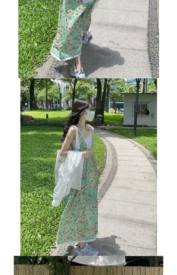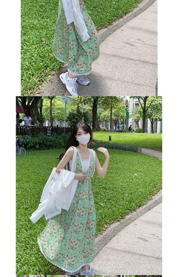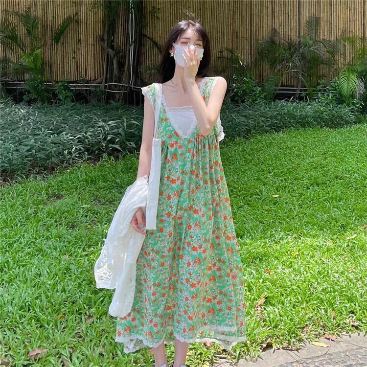 ドレス サマースタンダードグリーンフローラルスカート レースルーズシフォン レトロ 夏物 花柄 kumikum16951528149