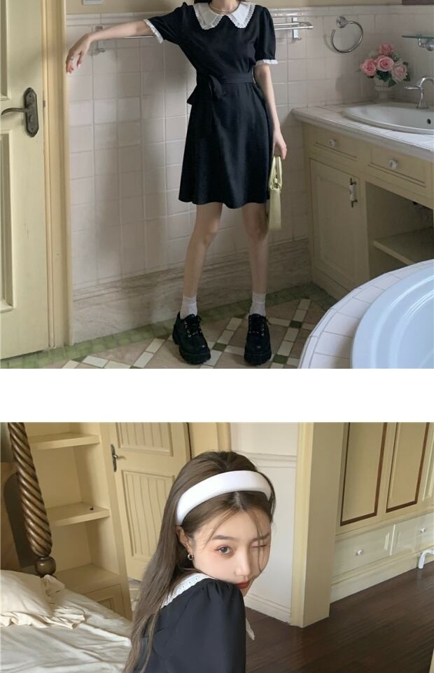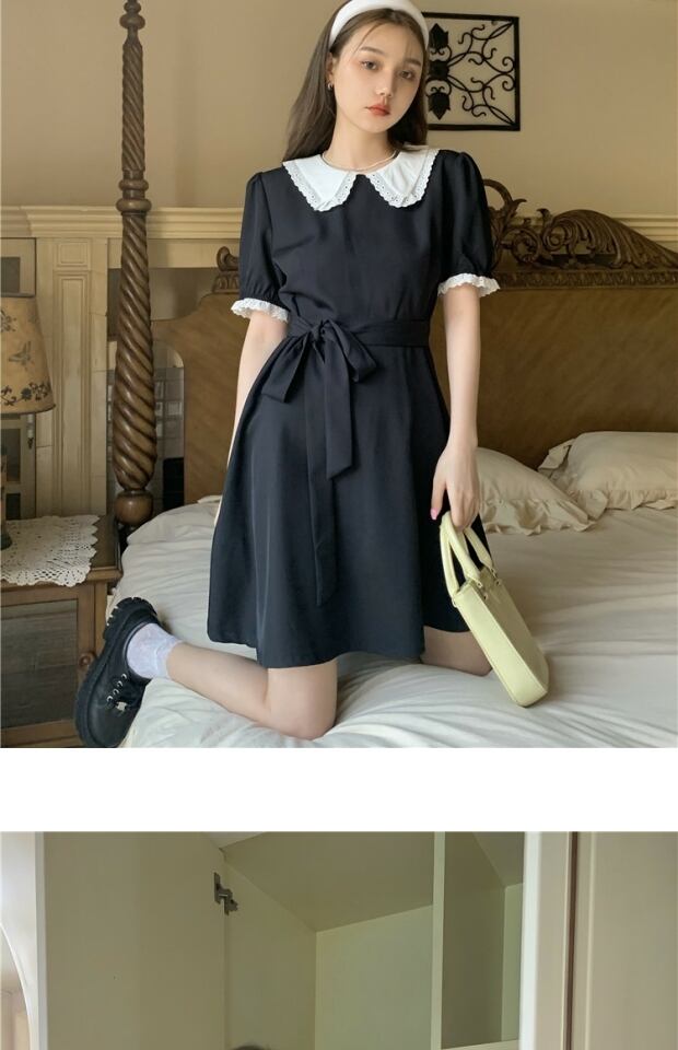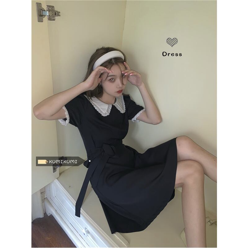 スタンダードレースカラーブラックドレス サマー薄手スカート レトロ 夏物 kumikum63377866201