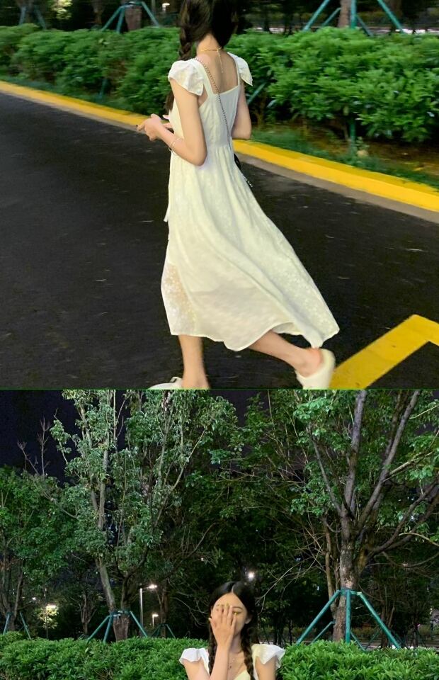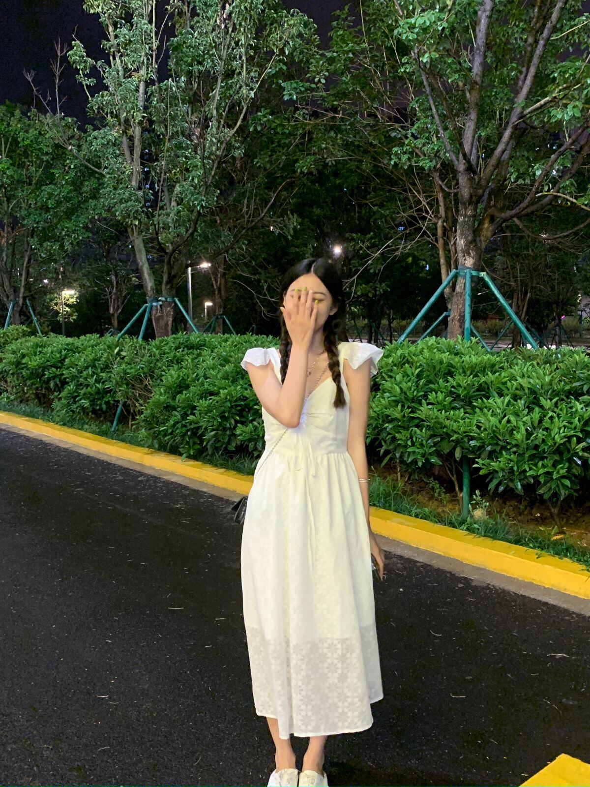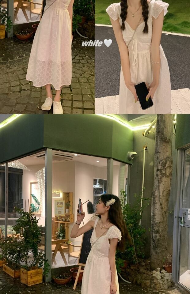 サマーホワイトドレス シフォンAラインスカート Vネック薄手 夏物 kumikum99770789097