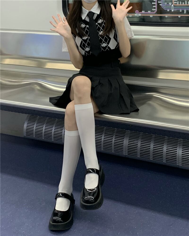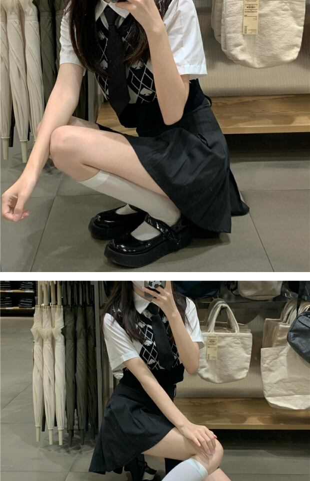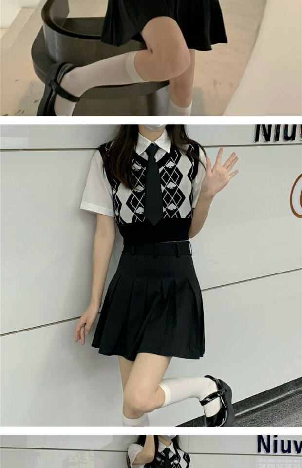 スタンダードカラーニットホワイトシャツ ブラックスカート サマーレディース レトロ 夏物 kumikum31446636076