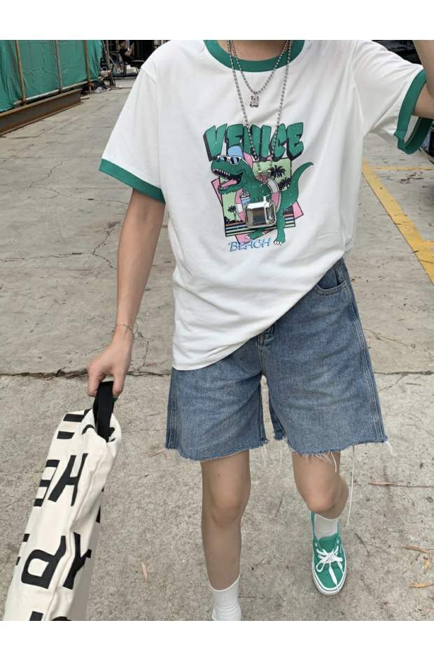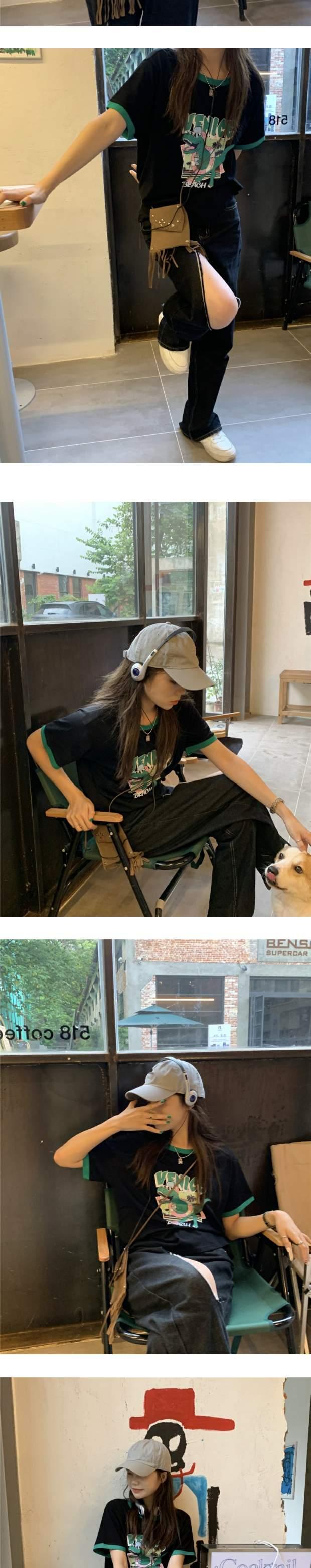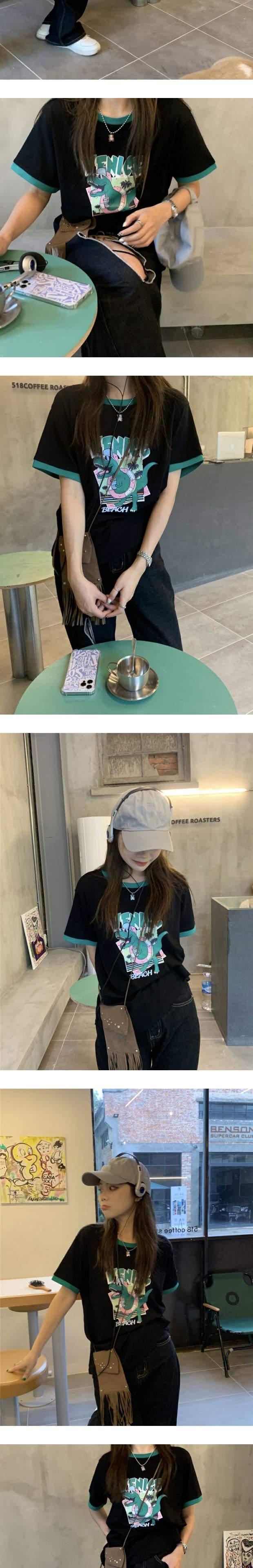 カラープリント柄Tシャツ サマー薄手ルーズブラック半袖スリーブトップス レディース ショート ハーフスリーブ 夏物 kumikum67091910575