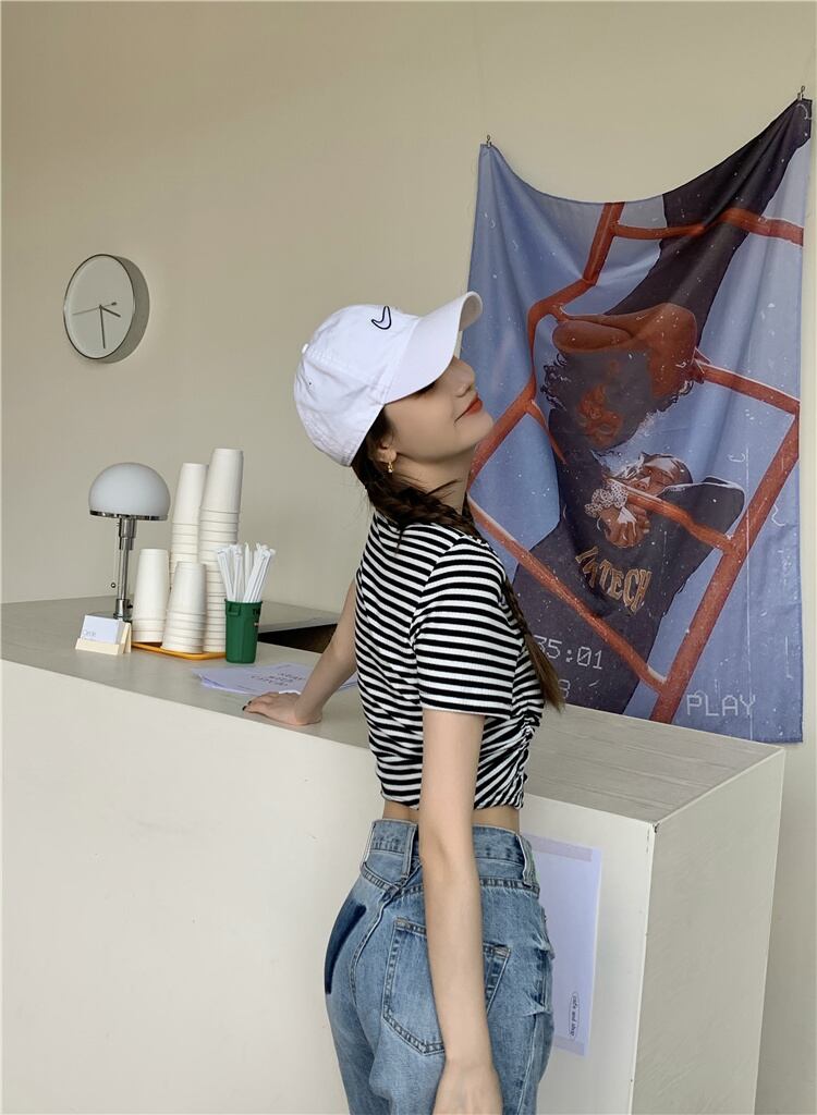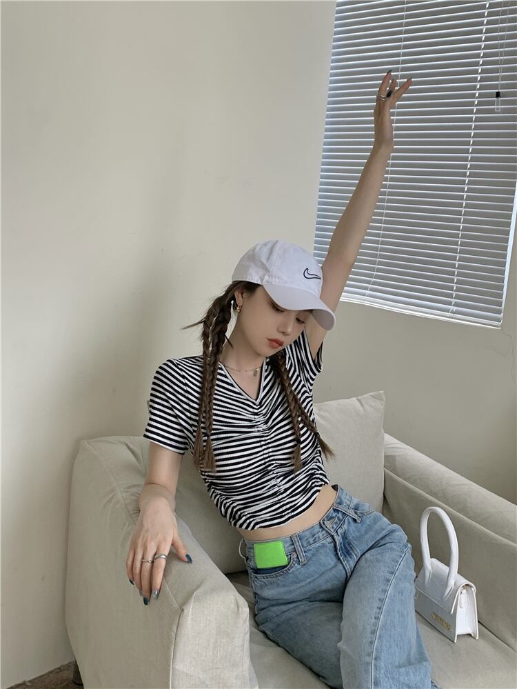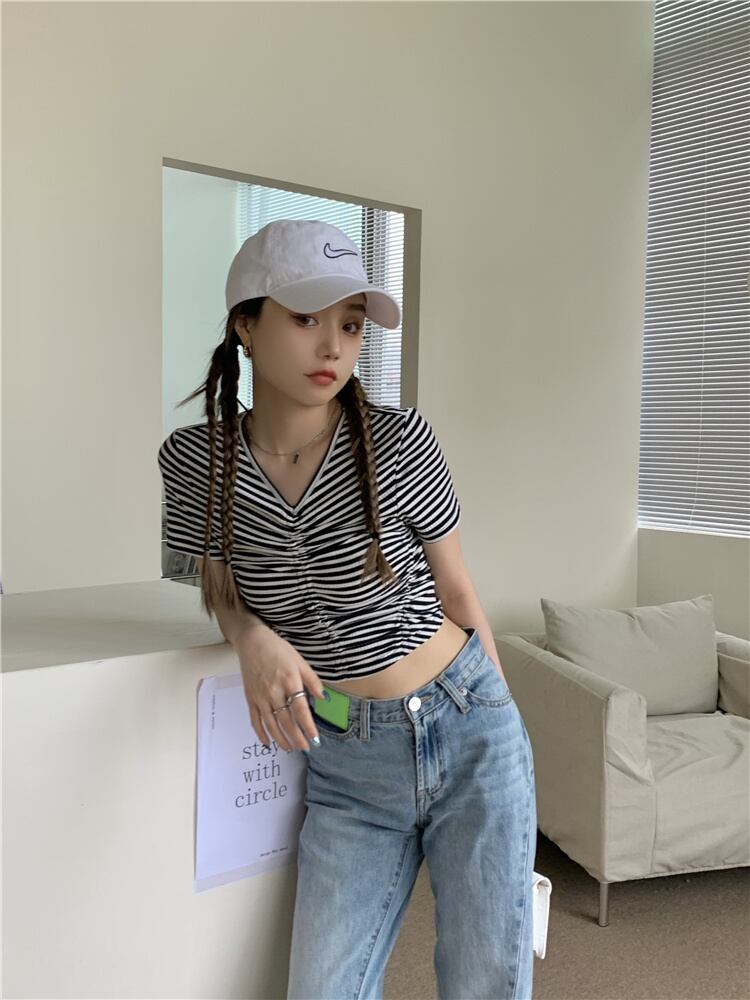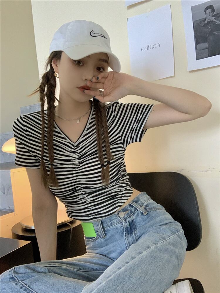 ギャザーストライプ薄手ショートTシャツ サマートップス レディース 夏物 kumikum91686156738