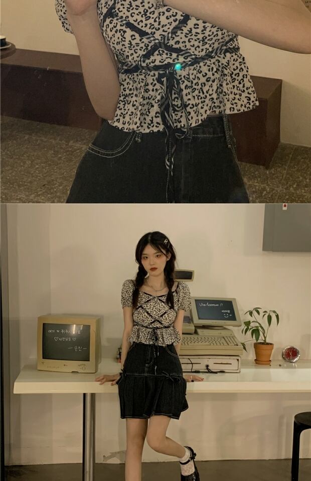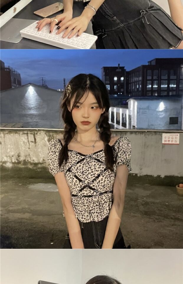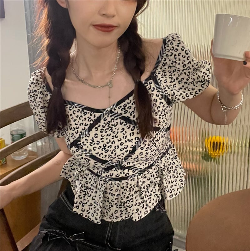 スタンダードレオパードプリント柄ショートスリムシャツ サマースリーブレディース レトロ 夏物 kumikum32225977980