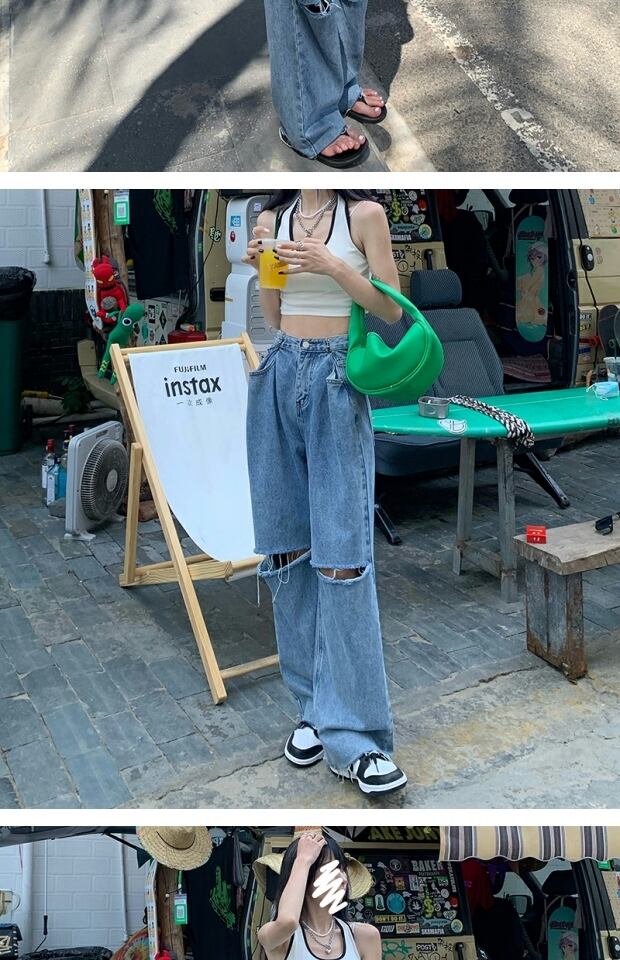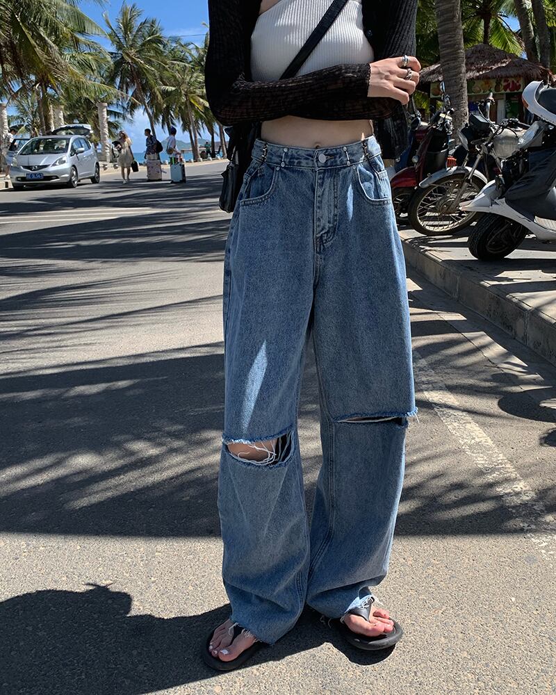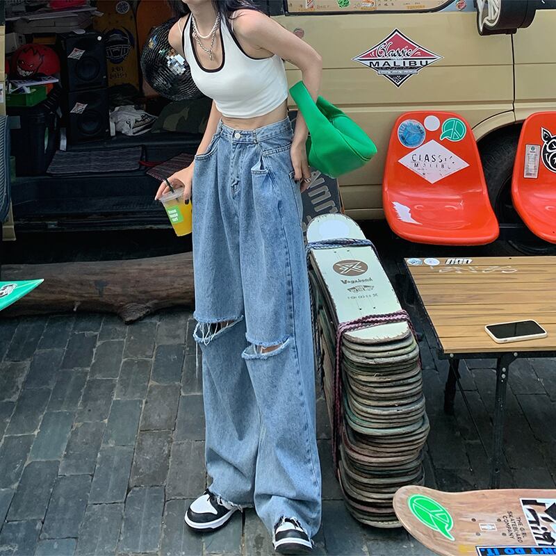 サマージーンズ ハイウェストウェストパンツ ルーズワイドレッグ 夏物 ワイドパンツ kumikum73426557875