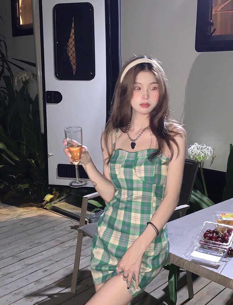 ウェストAラインスカート サマースタンダード格子柄ノースリーブドレス レトロ 夏物 kumikum90054057012