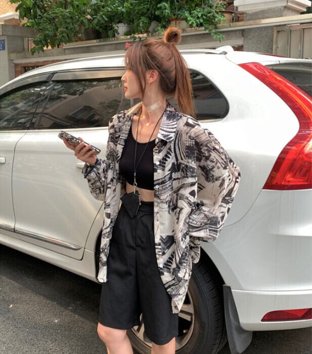 スタンダードプリントシフォンシャツ サマー薄手ルーズカジュアルレディース レトロ 夏物 kumikum40889526881