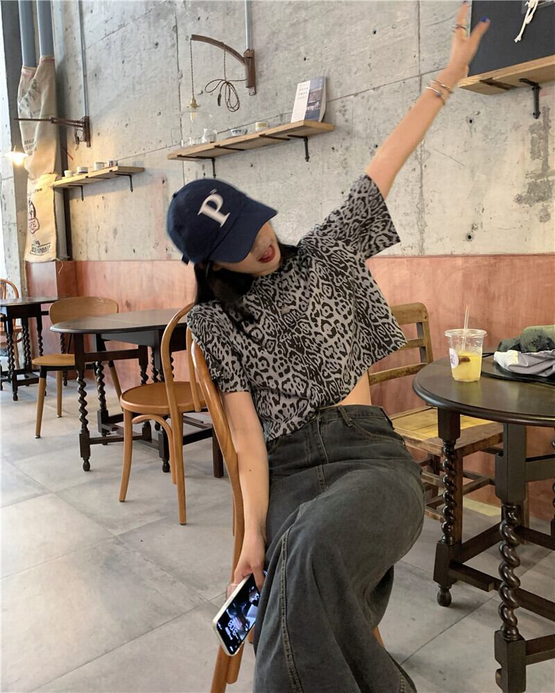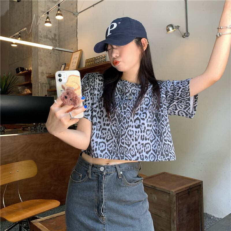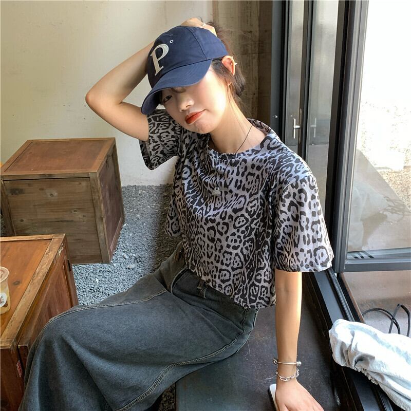 ルーズレオパードプリント柄薄手ショートシャツ サマーカジュアルTシャツ レディース 夏物 kumikum95092118990