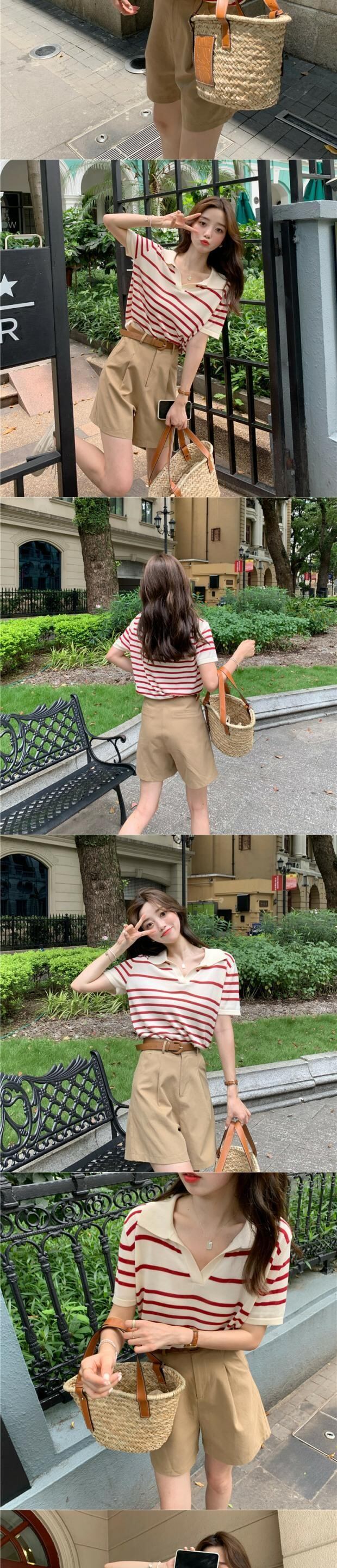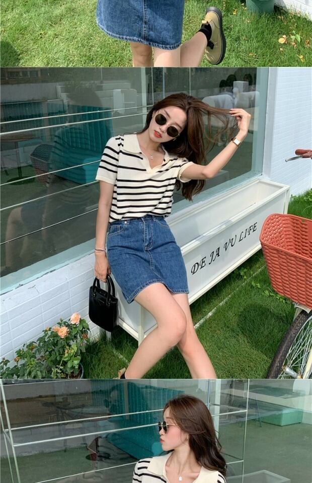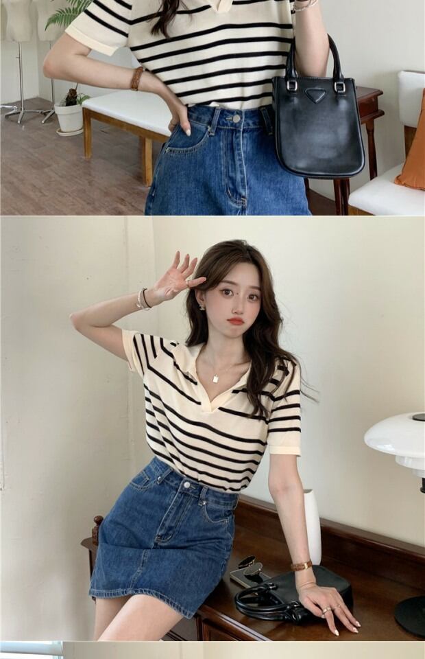 スタンダード薄手ストライプニットトップス サマーカジュアルTシャツ レディース レトロ 夏物 kumikum45483263462