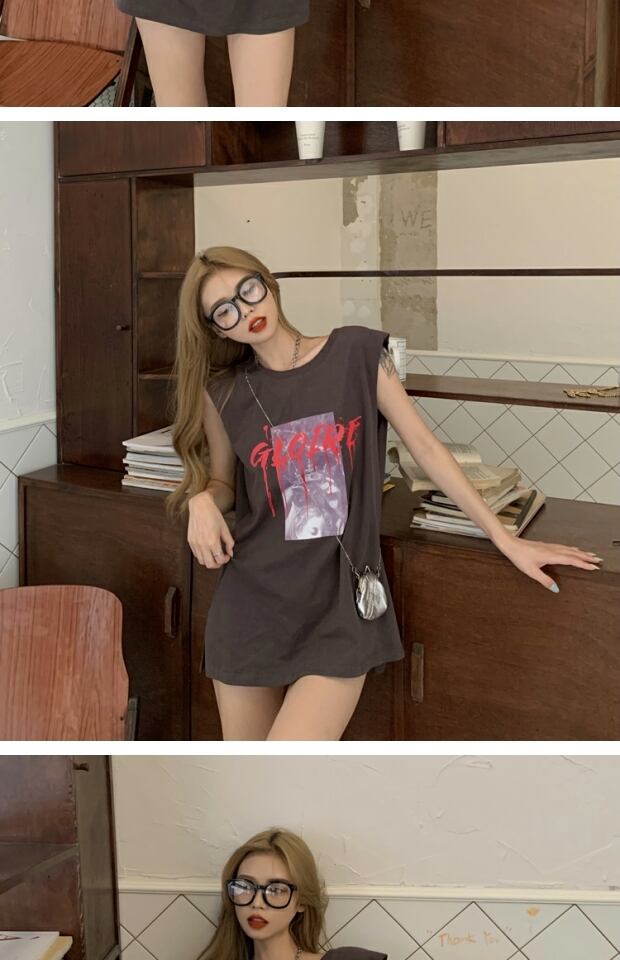 スタイルルーズカジュアルノースリーブトップス サマープリント薄手ラウンドネックTシャツ レディース かわいい 夏物 Oネック kumikum90825592297