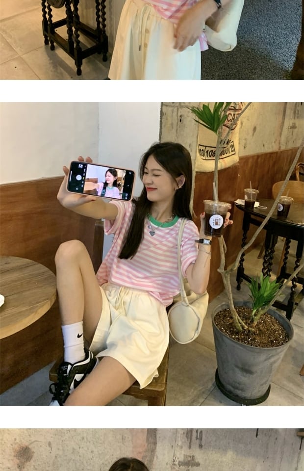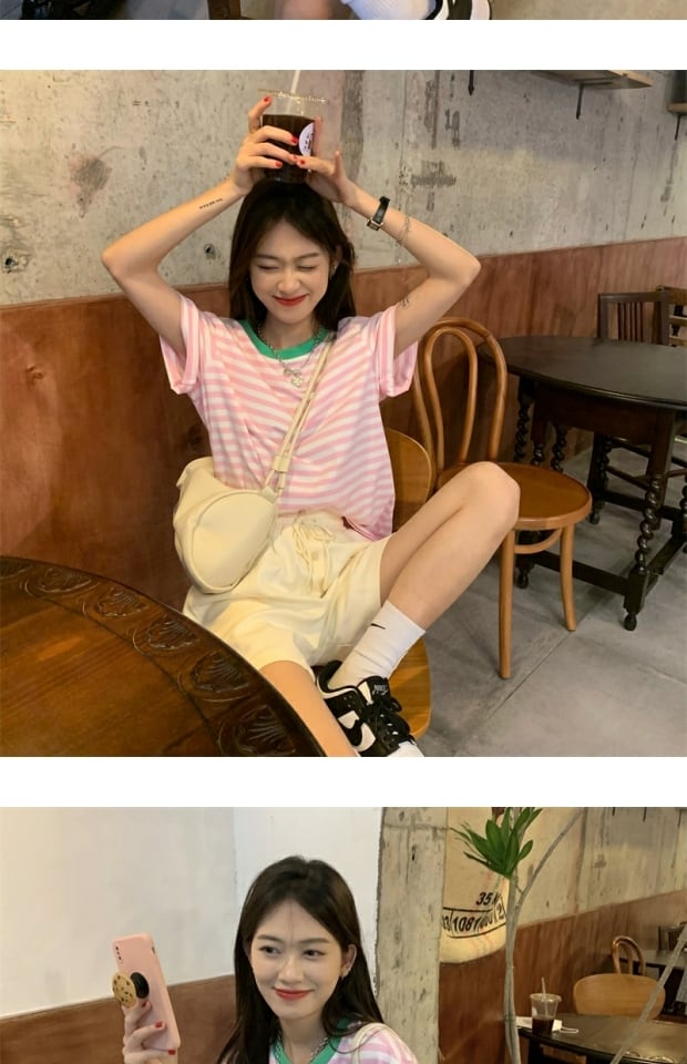 カラーラウンドネックストライプTシャツ サマーハイウェストショーツ レース 夏物 ブルマー Oネック レースアップ kumikum53237611539