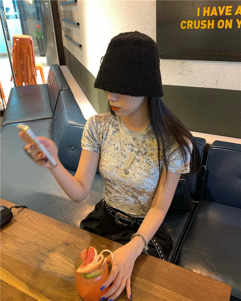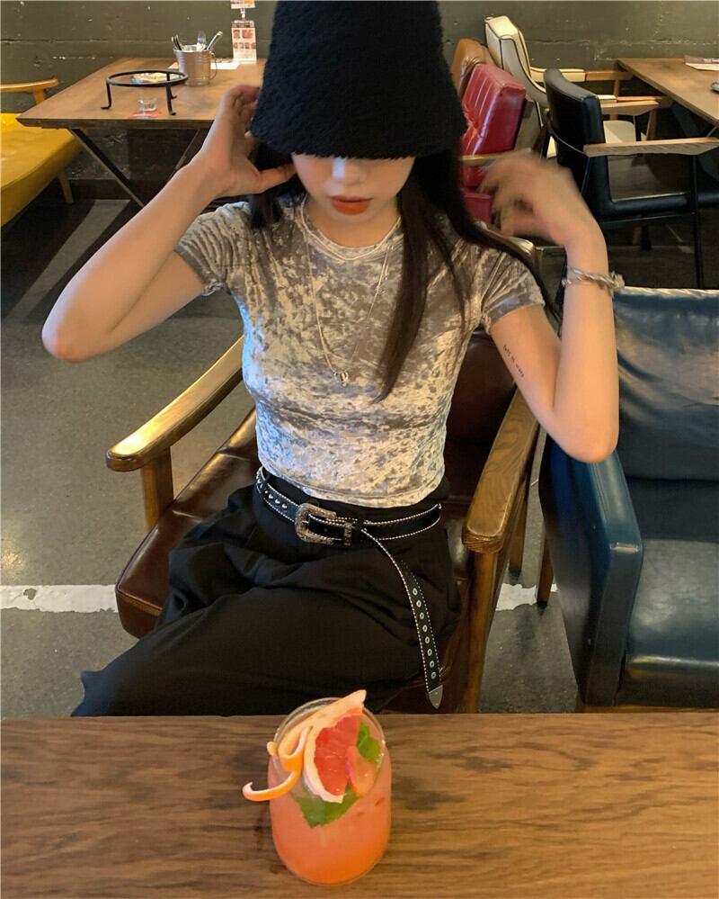 サマーシルバーグレーベルベットスリムショートTシャツ レッド薄手トップス レディース 夏物 銀 kumikum33784061163