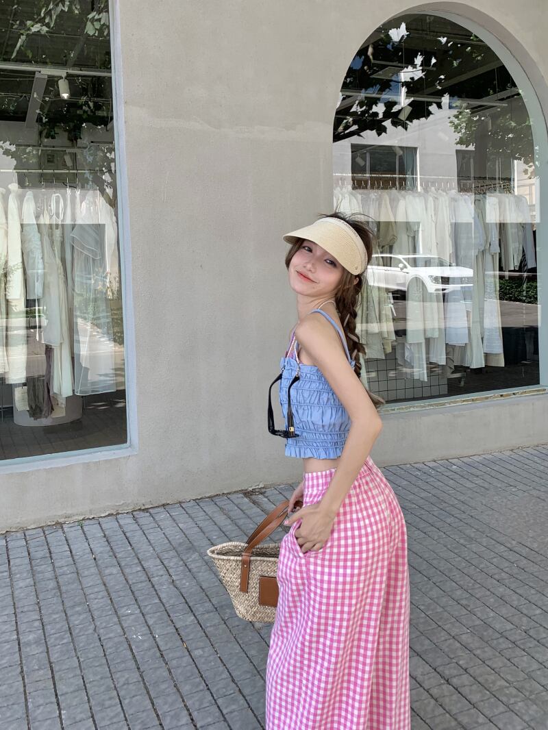 色:ブルーピンクのスリング,マスタードグリーンスリング,縞模様のスカート,格子縞のズボン