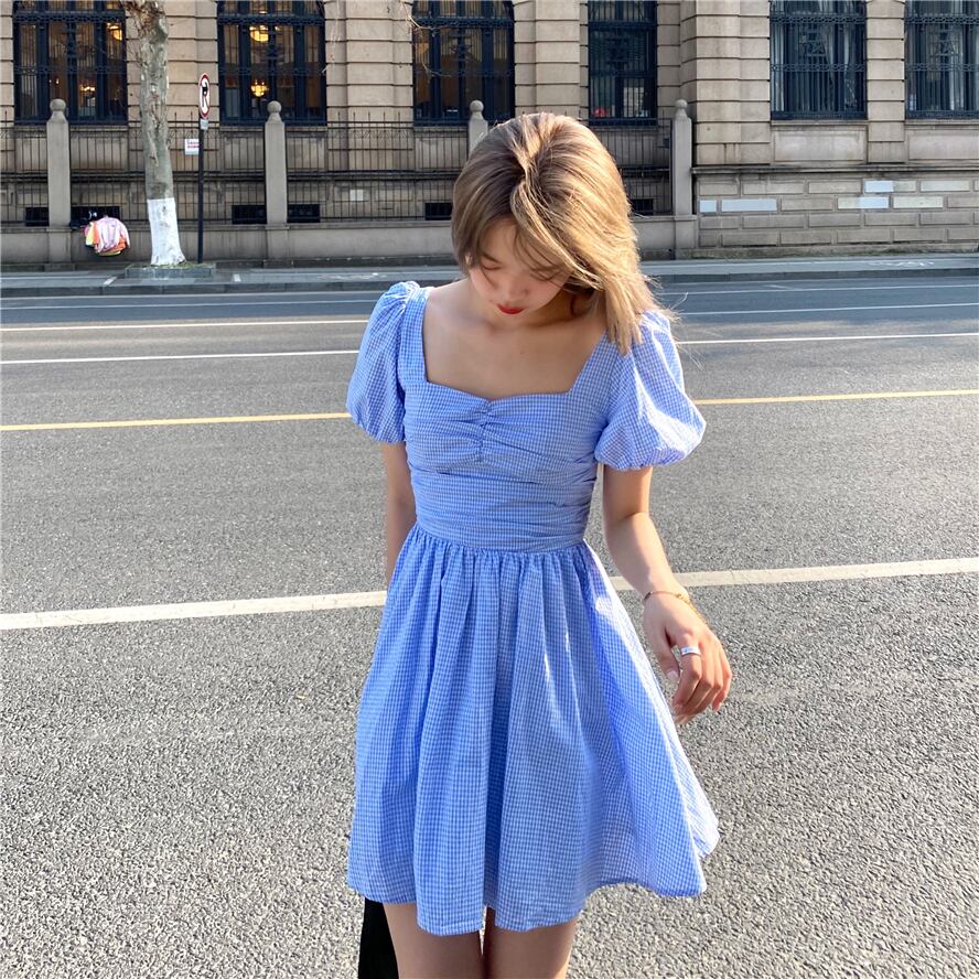 ブルー格子柄シャツ スカート サマースタンダードカラー薄手スリーブスリムドレス レディース レトロ 夏物 スクウェア kumikum40681704925