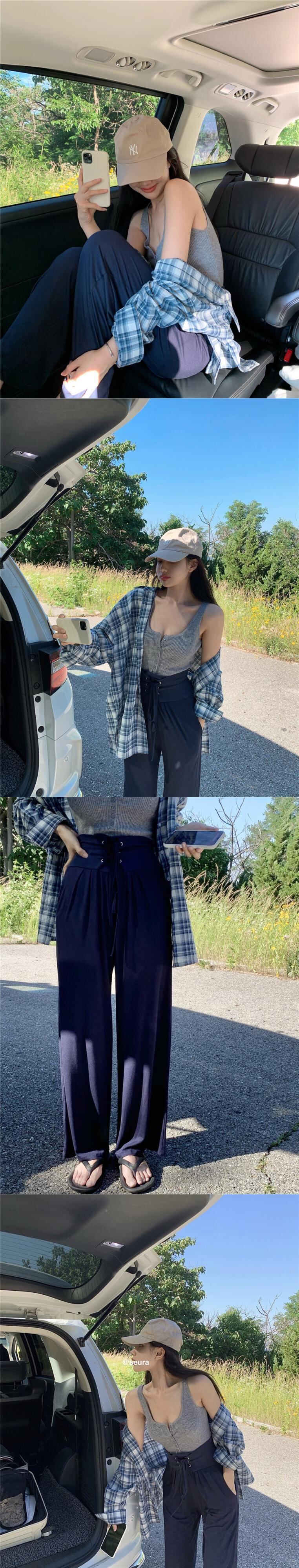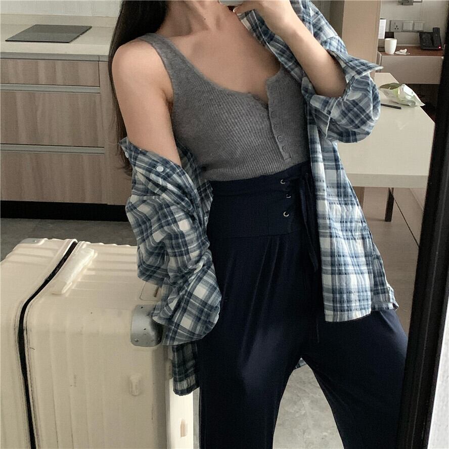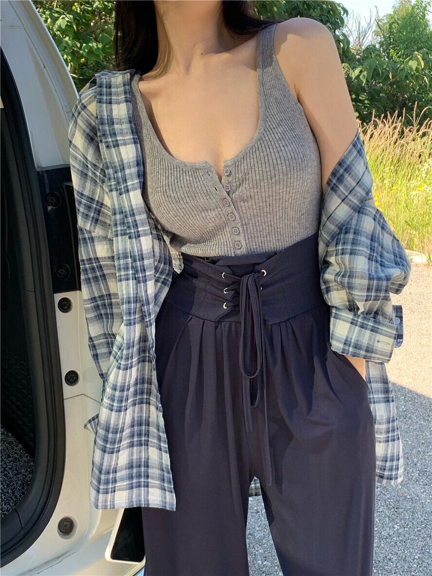 ベーシックスタンダード格子柄シャツ サマーハイウェストウェストワイドレッグレディース レトロ 夏物 ワイドパンツ kumikum51436522005