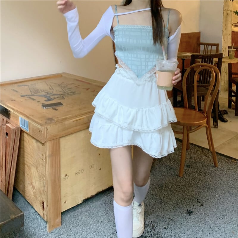 色:白いショール,ブラックショール,青いスリング,ブラックサスペンダー,白いスカート