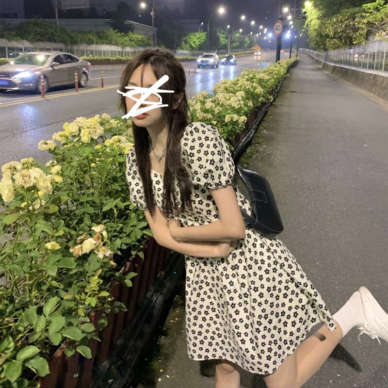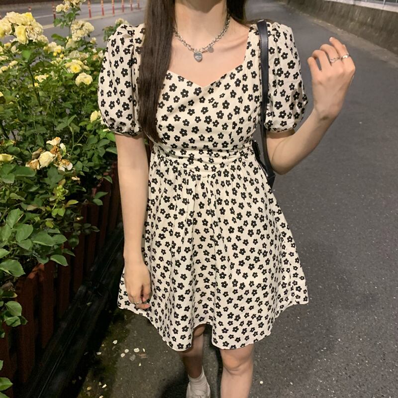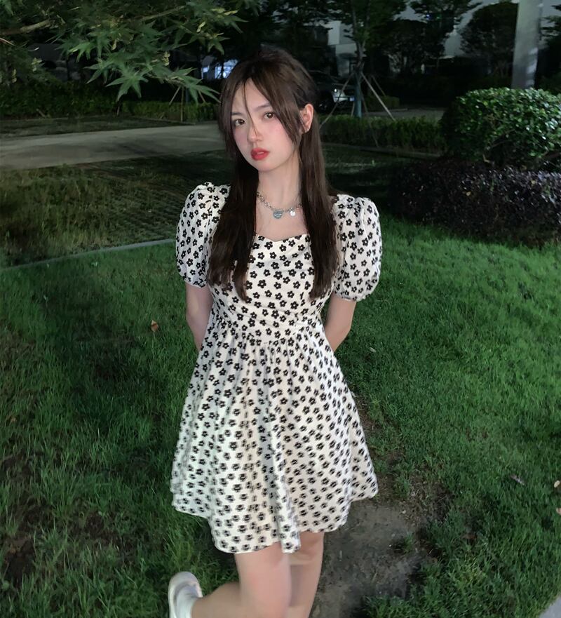スタンダードVネックフローラルスリーブAラインスカート サマードレス レディース レトロ 夏物 花柄 ピュア kumikum22665136789