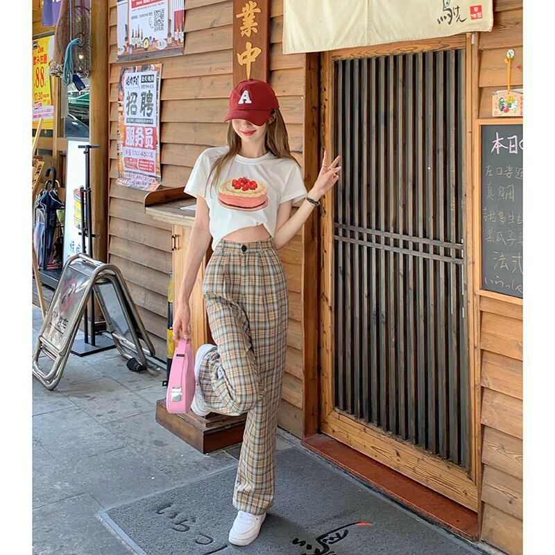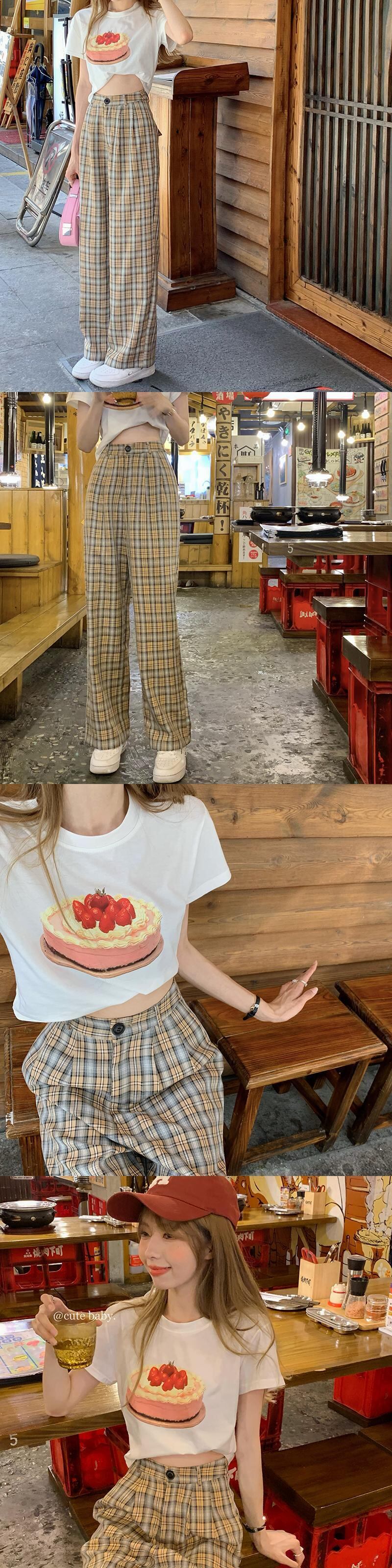 サマープリントTシャツ ハイウェスト格子柄パンツ カジュアル 夏物 kumikum13176425614