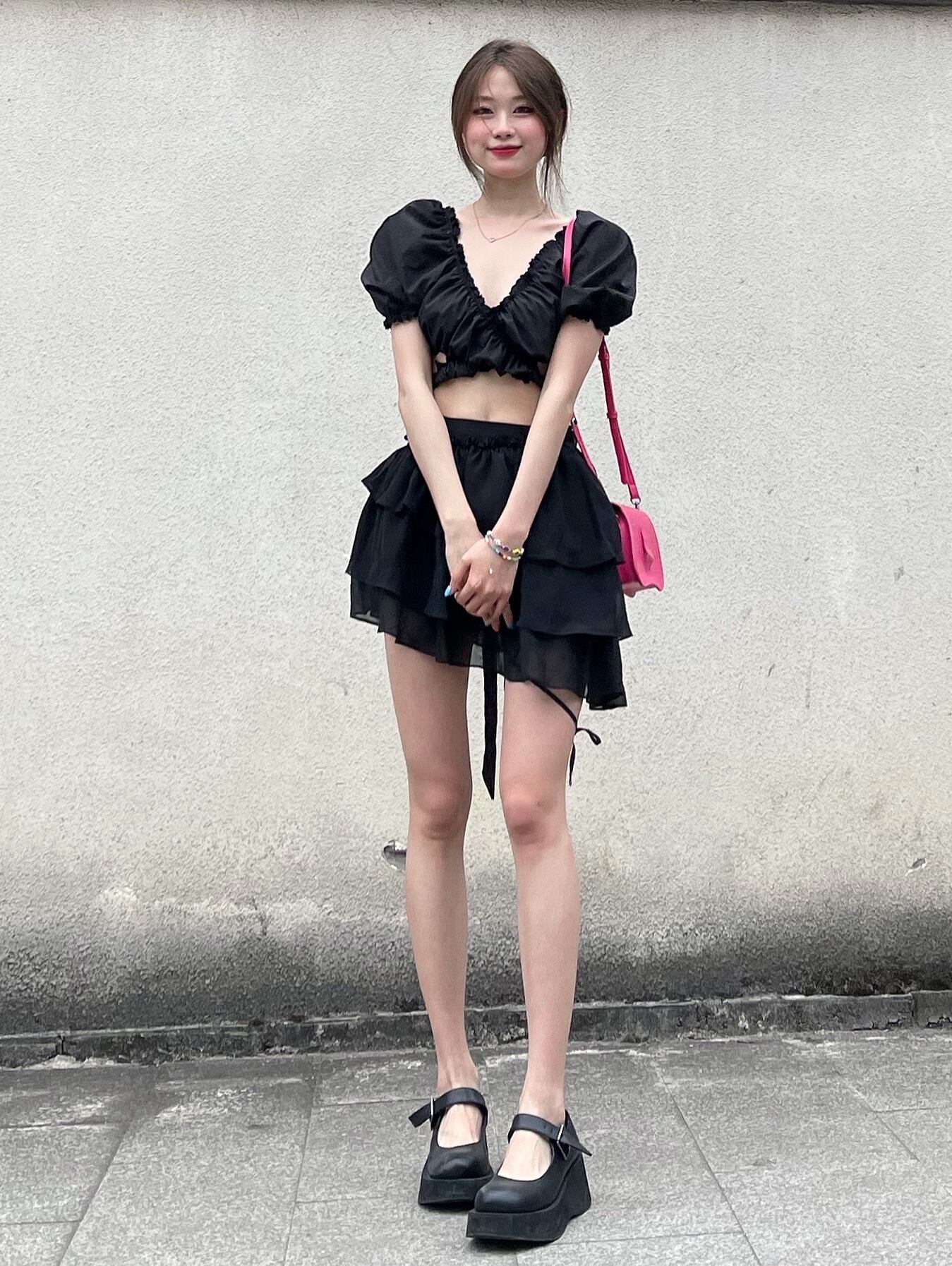 サマーショートトップス ハイウェストウェストシフォンスカート 大人ガーリー スウィート キュート カジュアル 夏物 kumikum75421999515
