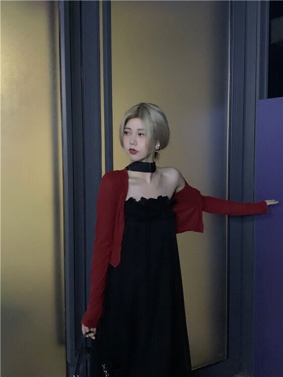 色:ブラックサスペンダースカート,ワインレッドカーディガン