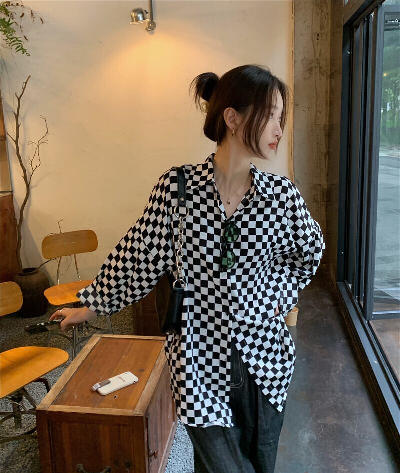 スタンダードブラックホワイト格子柄シャツ サマートップス ロング レトロ 夏物 kumikum31667914573