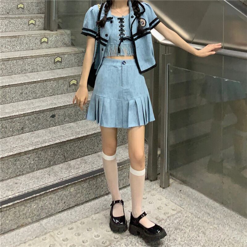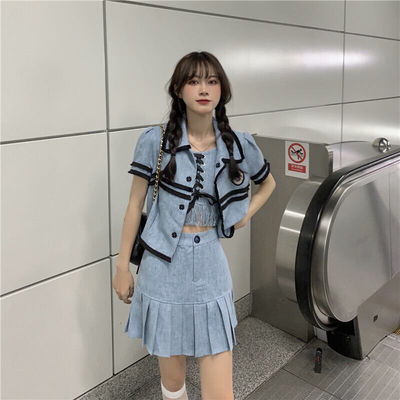 スタンダードサマーショートカーディガンジャケット ウェストプリーツスカート セット レトロ 夏物 kumikum44348573762