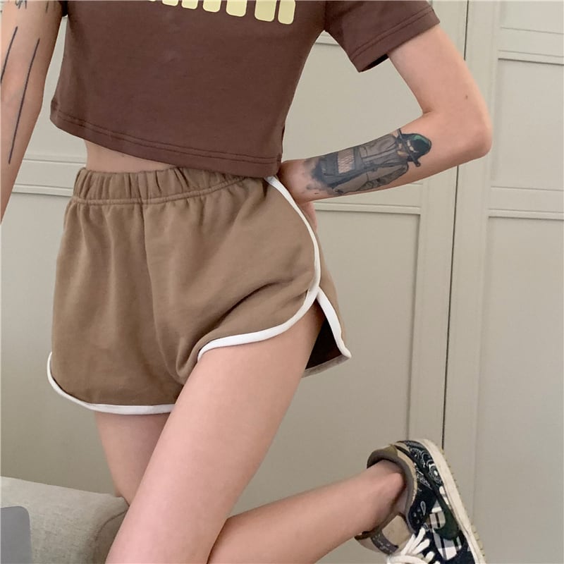 色:ライトグレーのTシャツ,コーヒー色のTシャツ,レトロなグリーンのショートパンツ,ライトカーキショーツ