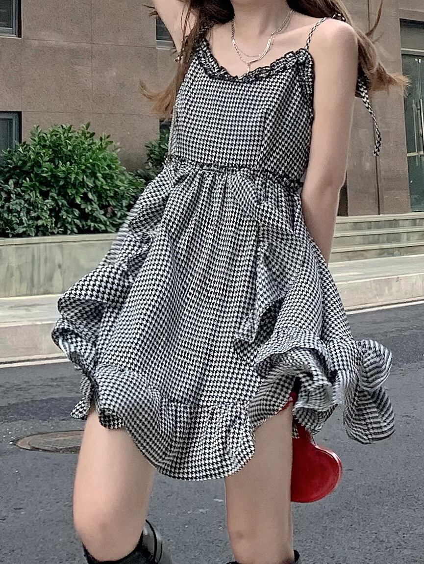 スタンダード薄手格子柄スカート サマーノースリーブドレス レディース レトロ 夏物 kumikum53846309476