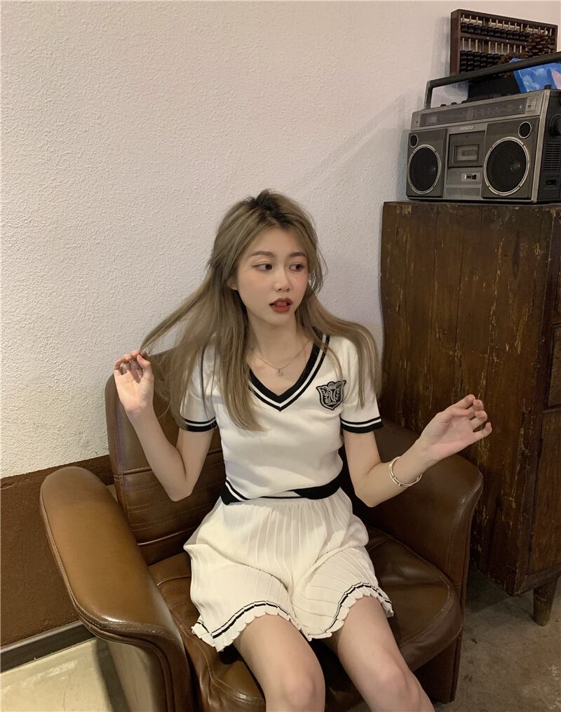 スタイルVネックスリムニットトップス サマーハイウェストスカート レディース 夏物 kumikum89095627637