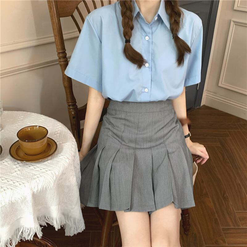 カジュアルソリッド カラーシャツ サマーハイウェストプリーツスカート レディース 夏物 ソリッドカラー kumikum18195303348