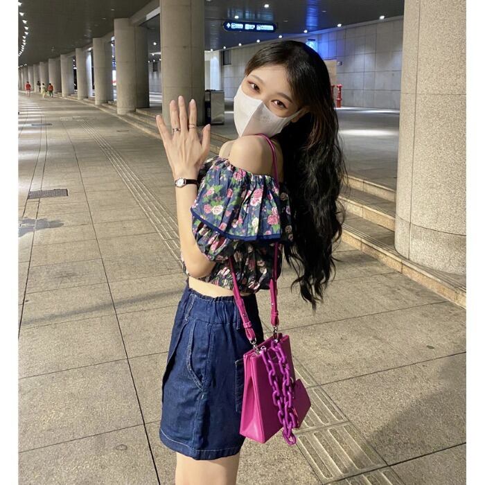 ブルーFlowerデザイン トップス オフショルダーシャツ フラワーデザイン kumikum65624256023