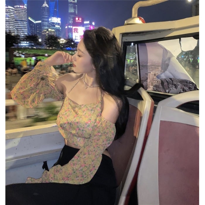 フローラルシフォンラインストーンホルターオフショルダートップス スタイルスタンダードシャツ レトロ 花柄 kumikum66610801382