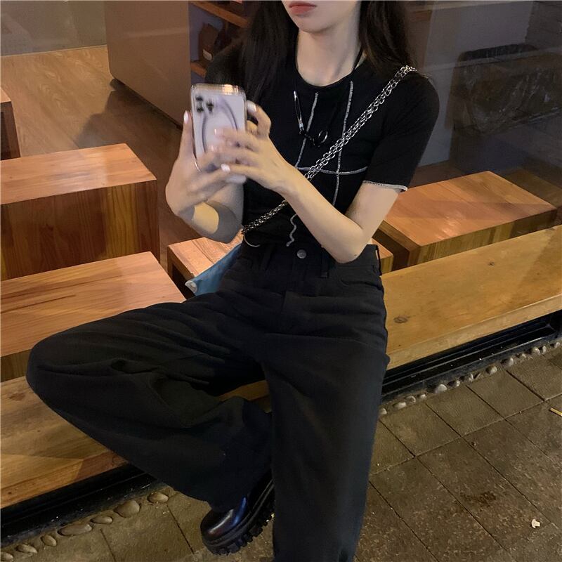 カラーカジュアルショートトップス サマーブラックTシャツ レディース 夏物 kumikum75426918091