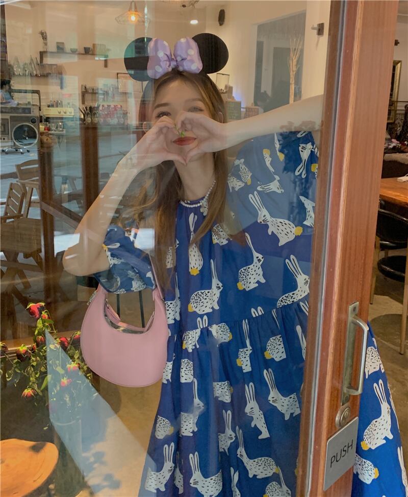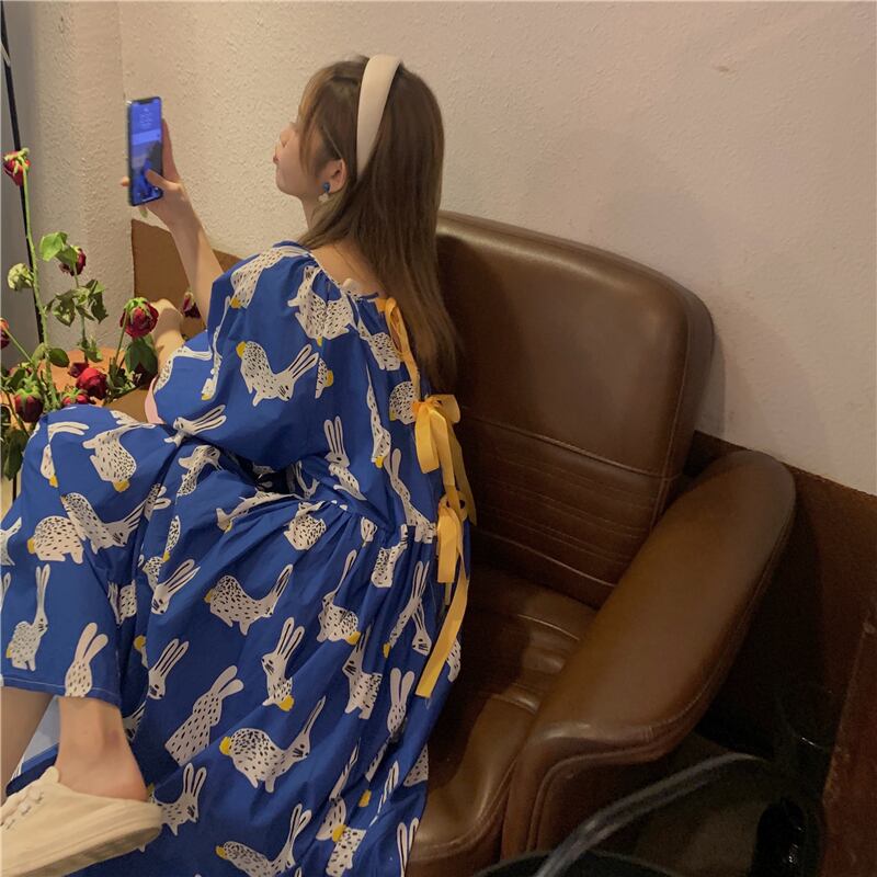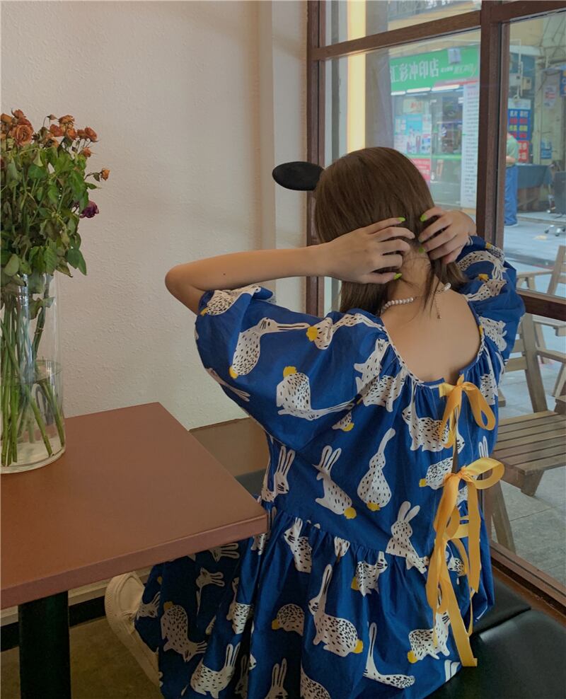 ブルードレス サマープリントスリーブスカート レディース 大人ガーリー スウィート キュート カジュアル 夏物 kumikum75234834765