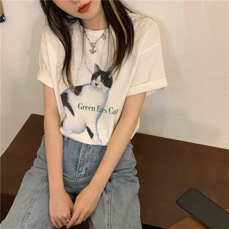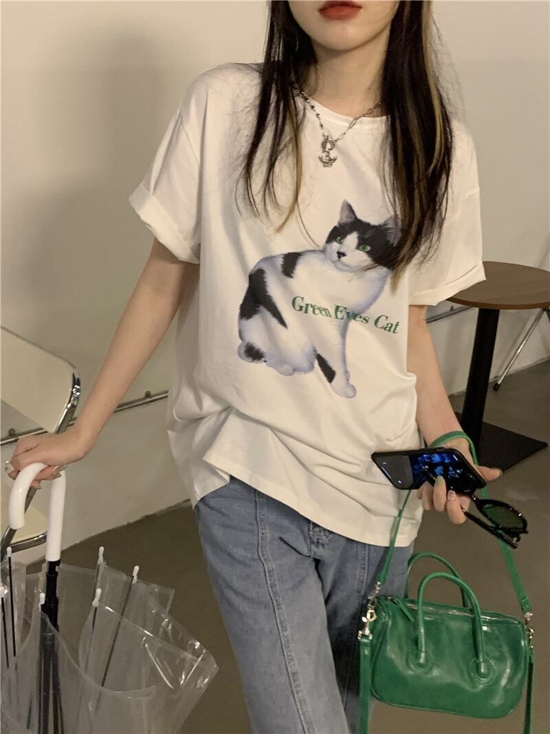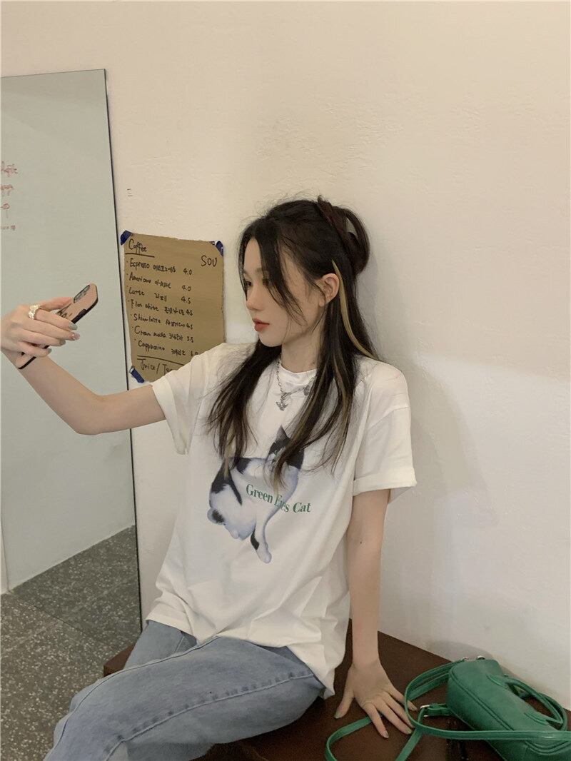 プリント柄ルーズカジュアルTシャツ サマー薄手トップス レディース 夏物 kumikum51972236924