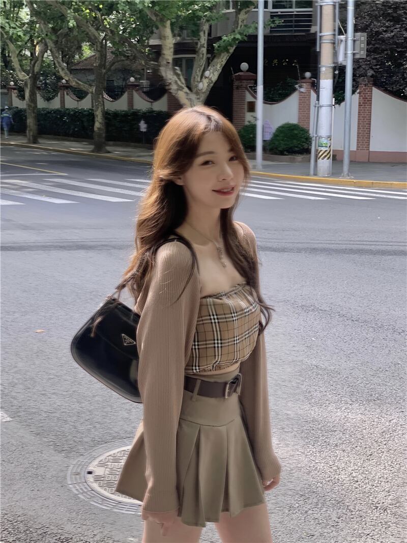 色:チェック柄チューブトップ,カーディガン,プリーツスカート(送信ベルト)