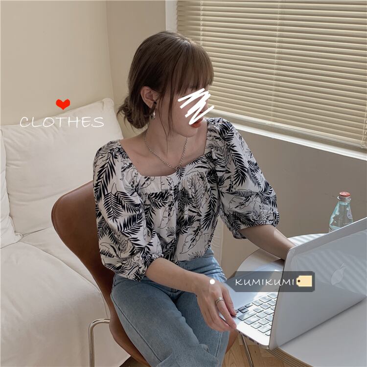 スタンダードフローラルカラーシャツ サマールーズスリーブトップス レトロ 夏物 花柄 スクウェア kumikum70529088273
