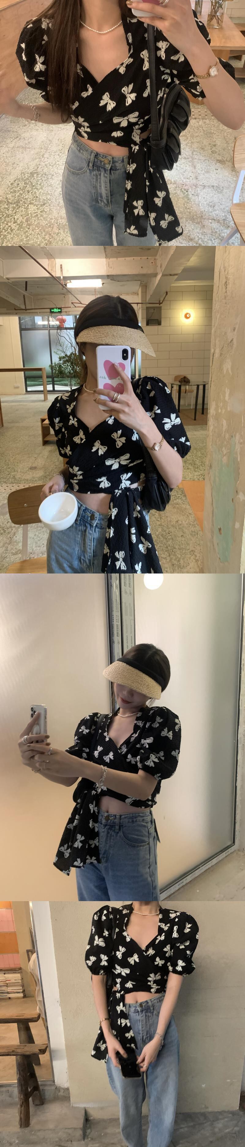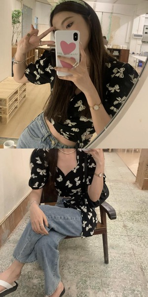 シフォンシャツ サマースタンダードショートウェストVネックトップス レトロ 夏物 kumikum4919783481