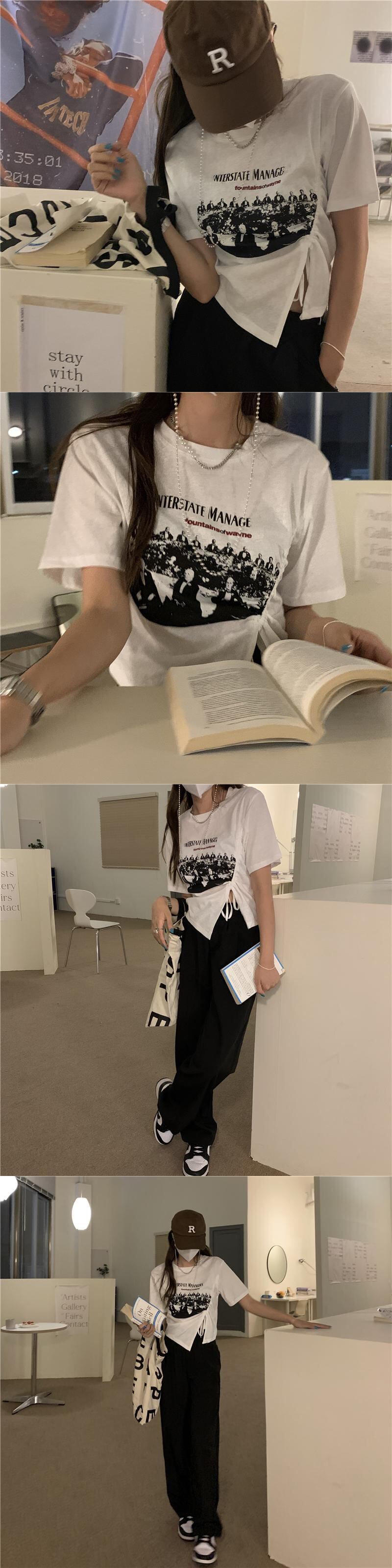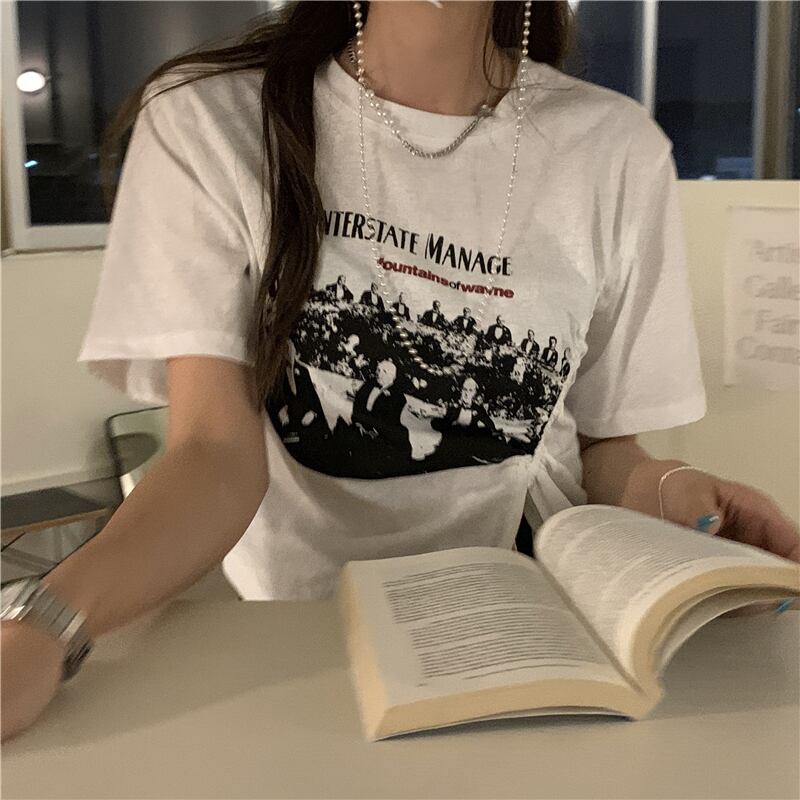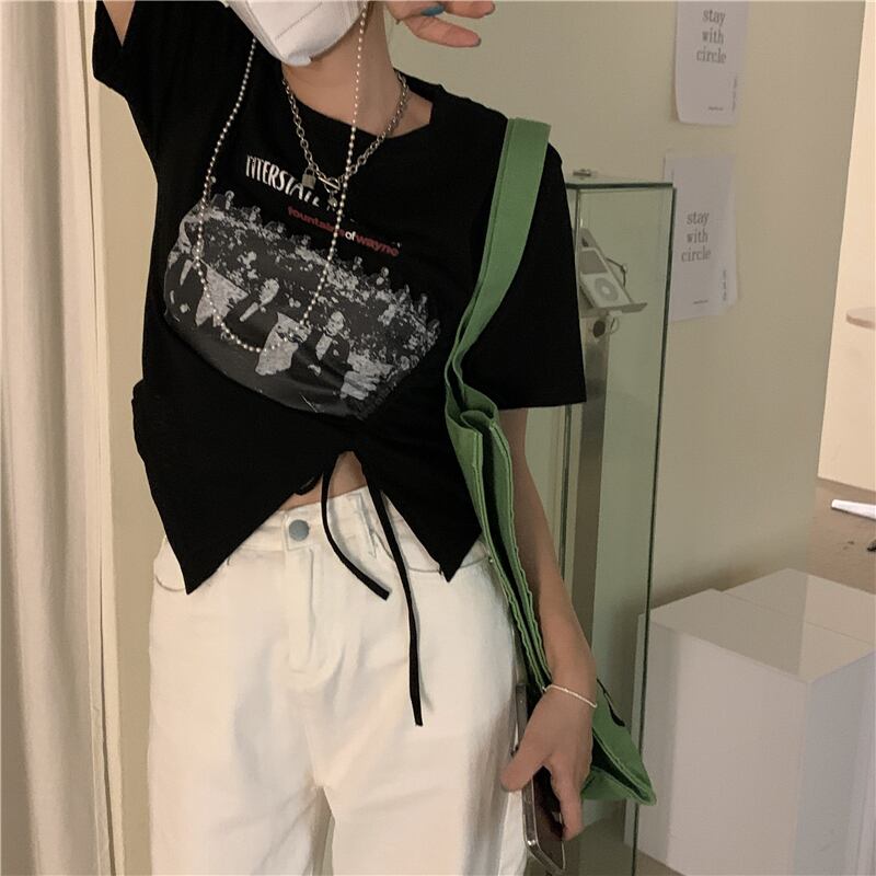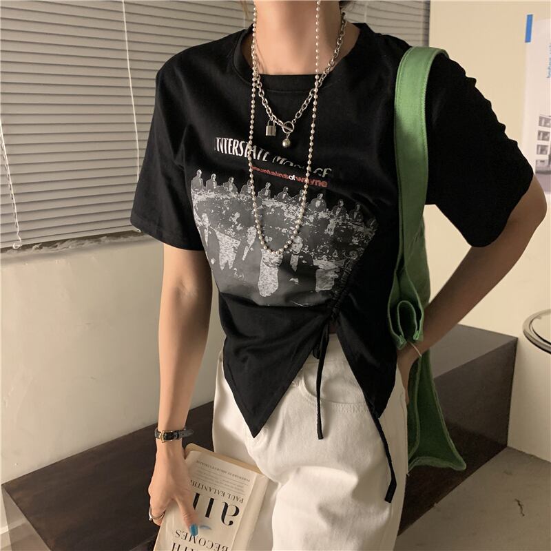 ギャザースタンダードプリント柄ショートTシャツ レディースサマーブラックトップス レトロ 夏物 kumikum8012964886