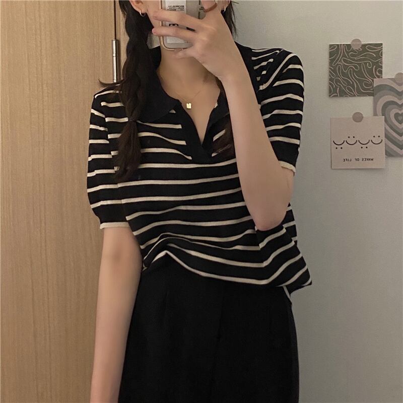 シャツ Tシャツ サマースタンダードルーズストライプセーター 薄手トップス レトロ 夏物 kumikum39180967889