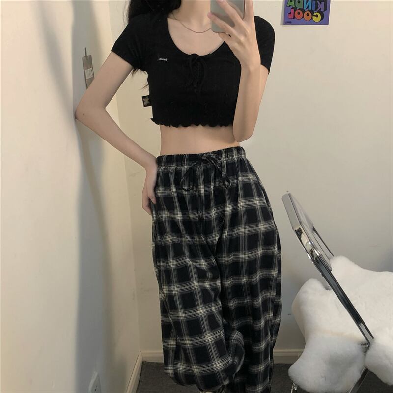 スタンダード格子柄パンツ 薄手サマーウェストルーズワイドレッグ レトロ 夏物 ワイドパンツ kumikum76210314351