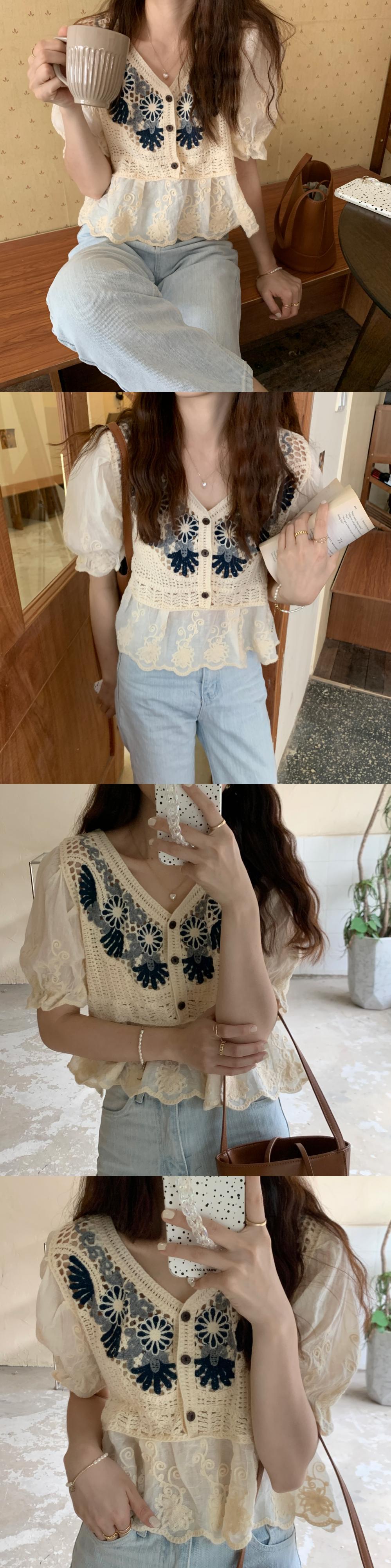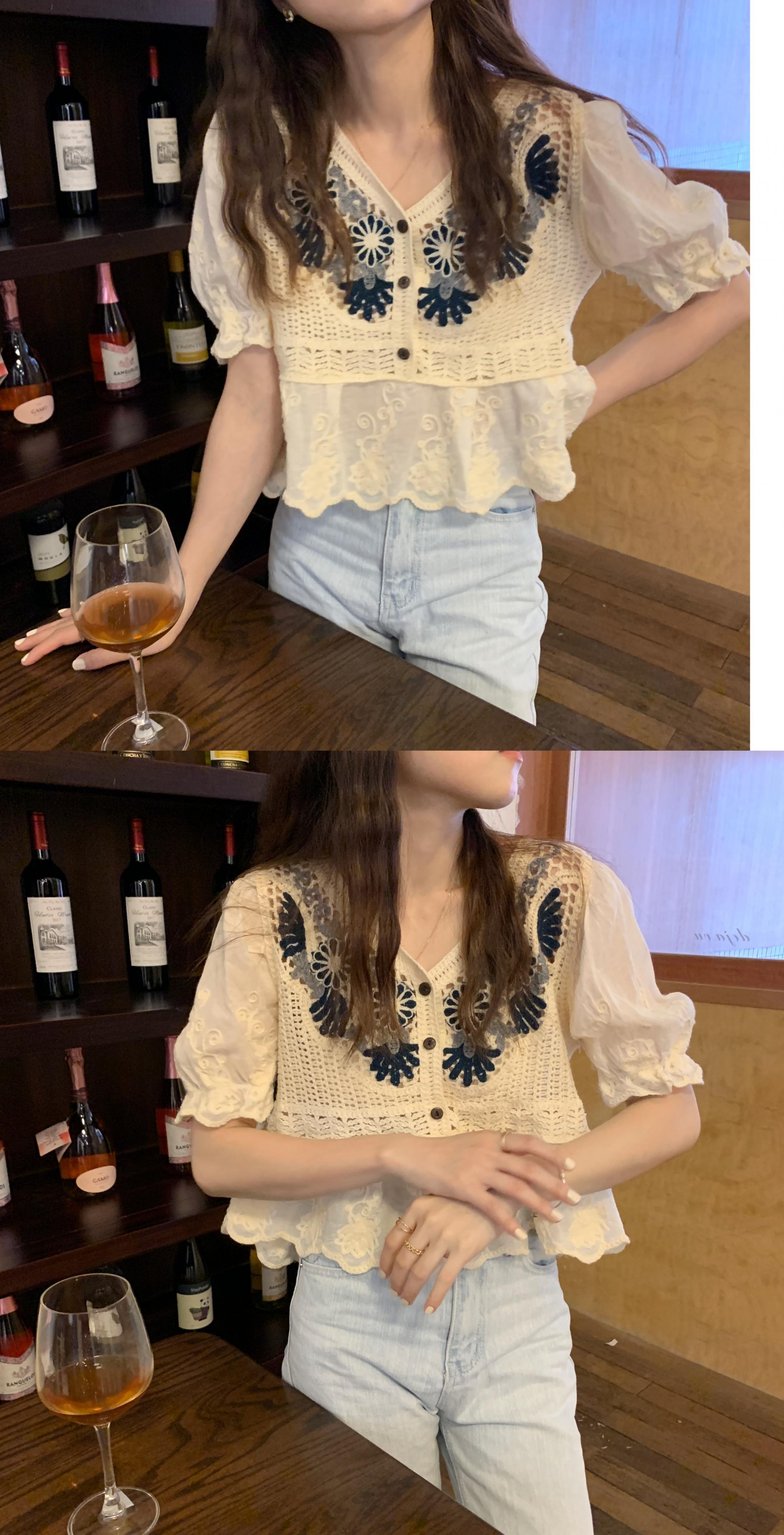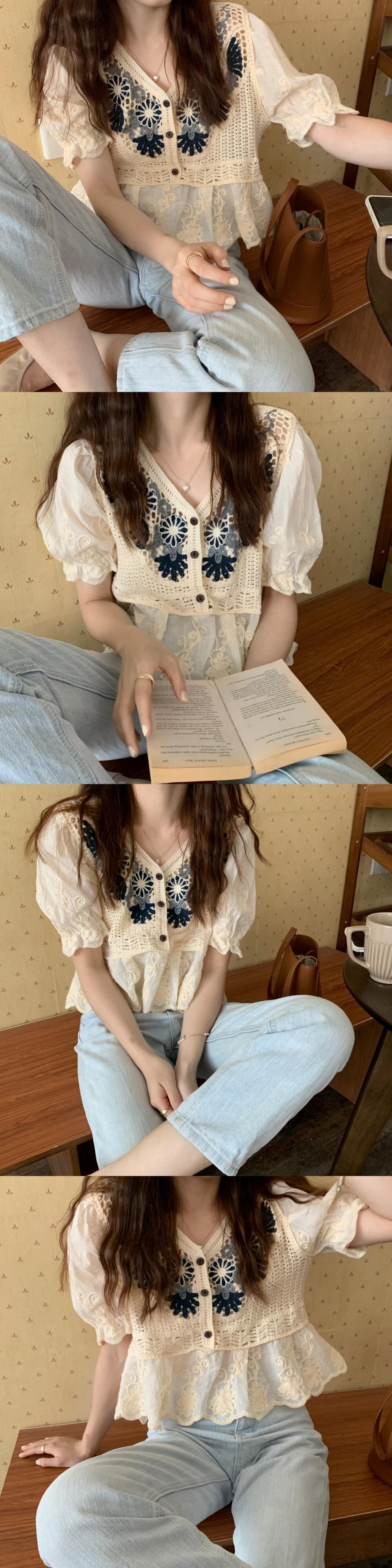 スタンダードVネックFlowerデザイン ショートスリーブレースシャツ サマートップス レトロ 夏物 フラワーデザイン kumikum79395654988