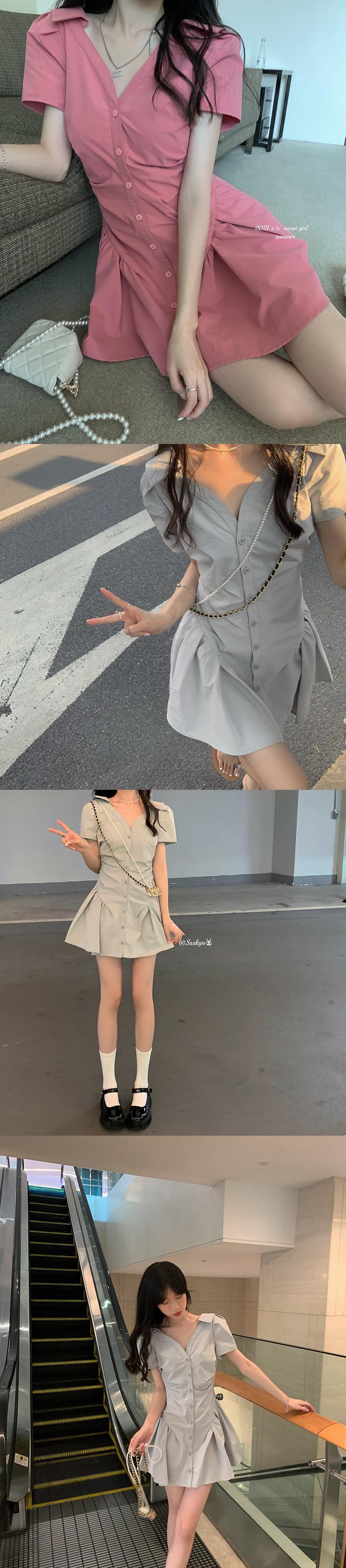 Vネックプリーツドレス サマーウェストスカート Aライン ピンク 夏物 kumikum20279384251