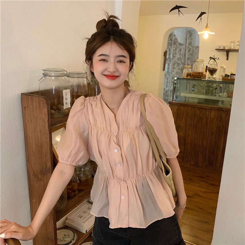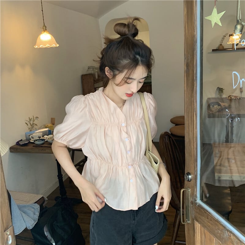 Vネックスリーブシャツ サマーウェストプリーツトップス 夏物 kumikum21631712135