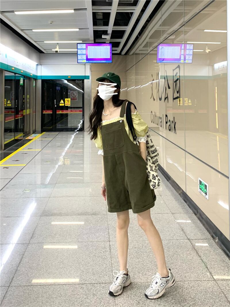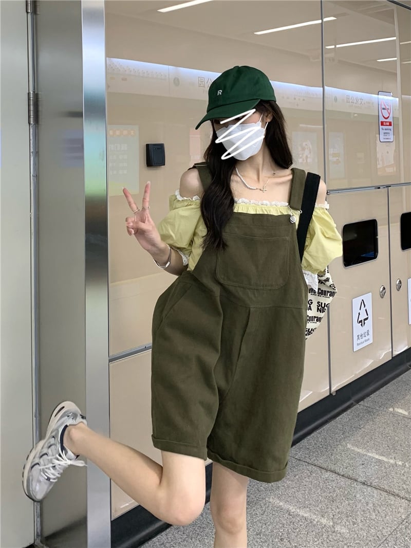 色:アーミーグリーンのオーバーオール,ワンショルダーシャツ
