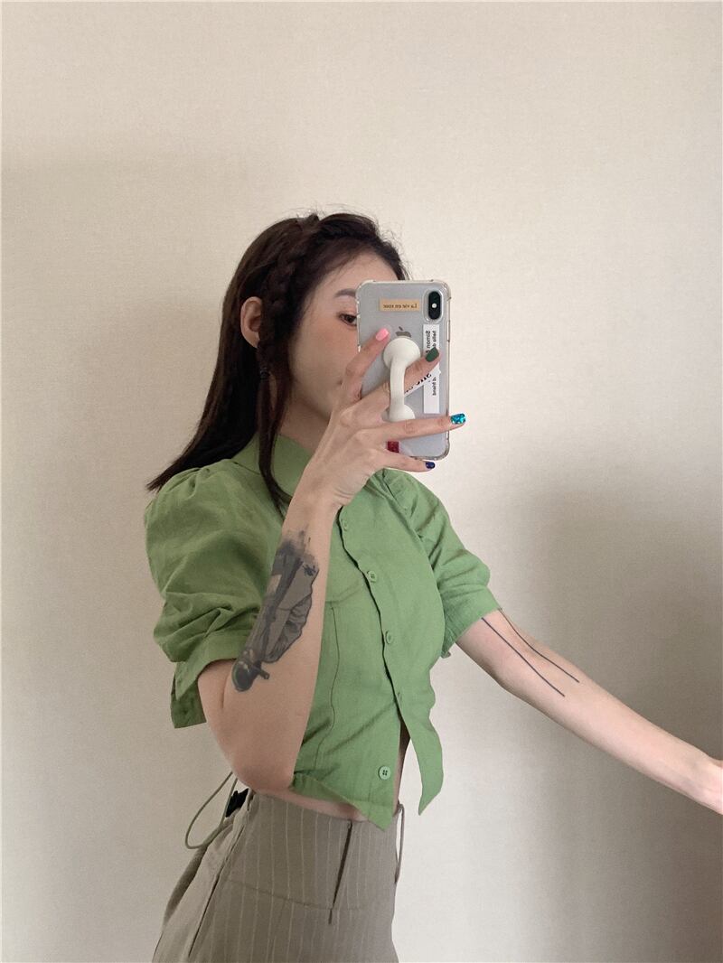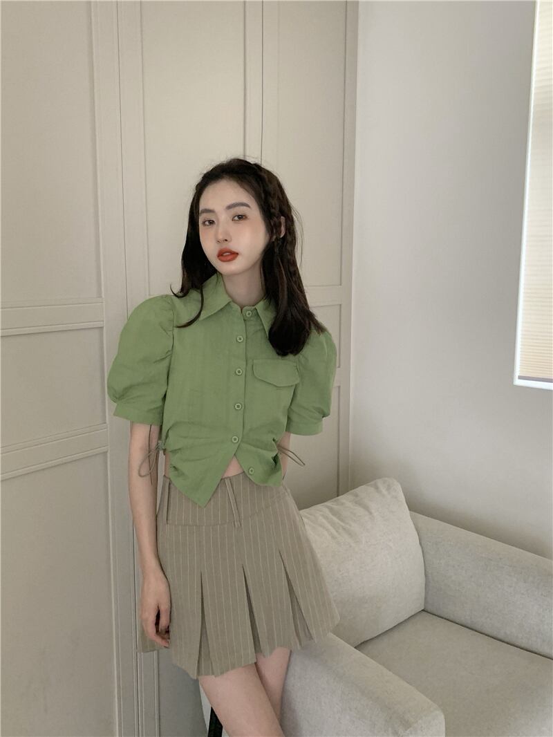 トップス サマーギャザーウェストショートシャツ スリムソリッド カラー 夏物 ソリッドカラー kumikum48790328288