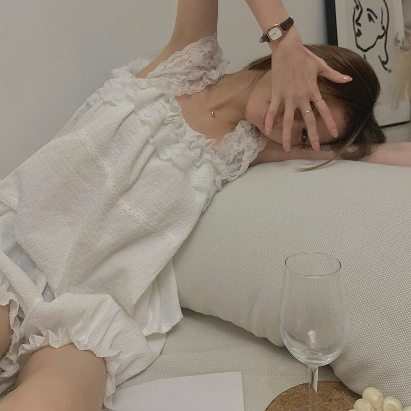 レッドレディースサマー薄手レースノースリーブトップス カジュアルショーツ 大人ガーリー スウィート キュート 夏物 ブルマー kumikum20322342208