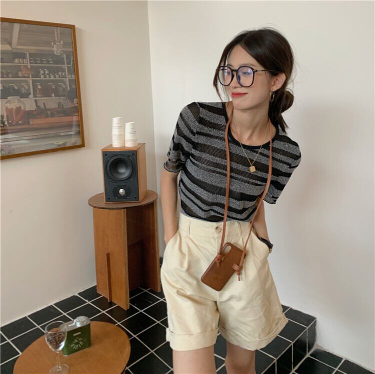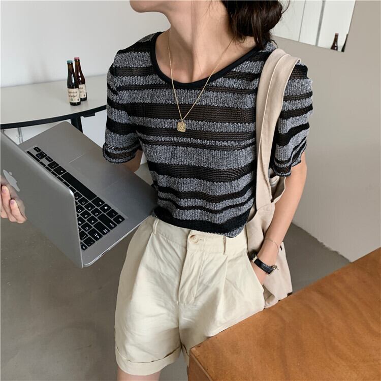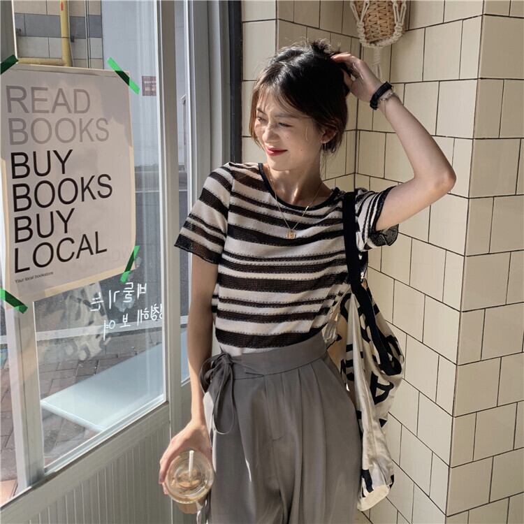 ストライプニットTシャツ レディースサマースタンダード薄手カラーラウンドネックトップス レトロ 夏物 Oネック kumikum99002518028